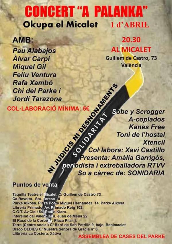 L'Assemblea de Cases del Park Alcosa (terme d'Alfafar) ha muntat la campanya A Palanka per a arreplegar fons per a fer front als desnonaments i els juïns amb els quals amenacen al veïnat obrer del barri Orba: un d'ells serà este concert solidari, Okupa el Micalet, presentat per Amàlia Garrigós, en la qual els artistes donaran suport amb la seua música a la causa.