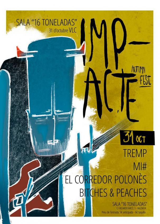 Primer concert estacional de l'ajuntada de grups valencians de pop i de rock alternatiu mals d'aparellar dins dels circuits oficialistes: esta vespra de Tots Sants s'ajuntaran els alcudians Bitches & Peaches (rock roscà), els ontinyentins El Corredor Polonés (post grunge merut), els riberencs Mi Sostingut (pop llarg) i els gaters Tremp (pop mariner) per a un bon recital de guitarrades amb distorsió i trompades de bateria. Si veniu disfressats vos caurà algun colpet debades.