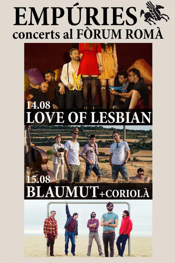 Empúries és una de les zones de major interès cultural de Catalunya amb un paratge natural privilegiat. ?EMPÚRIES _Concerts al Fòrum Romà, és el nom propi amb el qual es pretén consolidar la proposta musical d’estiu a les Ruïnes d’Empúries.? Un espai amb una llarga tradició en concerts i música en directe. Enguany TEMproductions amb la col.laboració del Museu d’Arqueologia de Catalunya-Empúries,organitza els propers 14 i 15 d’agost dues nits de concerts on actuaran LOVE OF LESBIAN, BLAUMUT I CORIOLÀ. Un lloc especialment escollit per poder realitzar concerts, on entorn, art i música faran possible unes nits màgiques d’estiu.