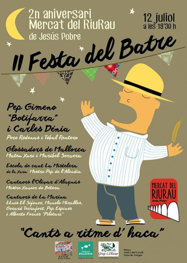 Carles Dénia i Botifarra concert Jesús Pobre, entre altres artistes. Ja tenim el cartell que anuncia la Festa del Batre i el segon aniversari del nostre mercat. La festa començarà a les 19.30 però no sabem quan acabarà, perque el cartell és una canya. A més del productes de les nostres parades, hi haurà una barra amb beguda i menjar. També podeu portar-vos taula i cadires i quedar-vos a sopar a la fresca amb nosaltres. Vos esperem amb moltes ganes per gaudir junts d’una nova celebració de les nostres arrels!