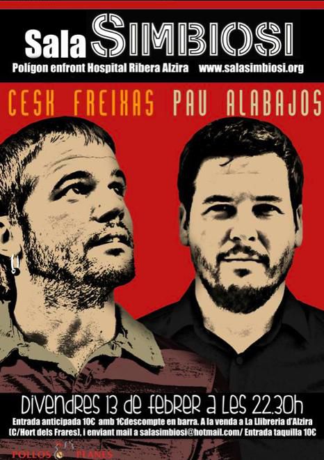 El divendres 13 a les 22.30h actuaran en directe PAU ALABAJOS i CESK FREIXAS. Les entrades estan a la venda per 10€ (amb 1€ de descompte en barra) a La Llibreria d'Alzira (C/Hort dels Frares) o enviant un mail a [email protected]