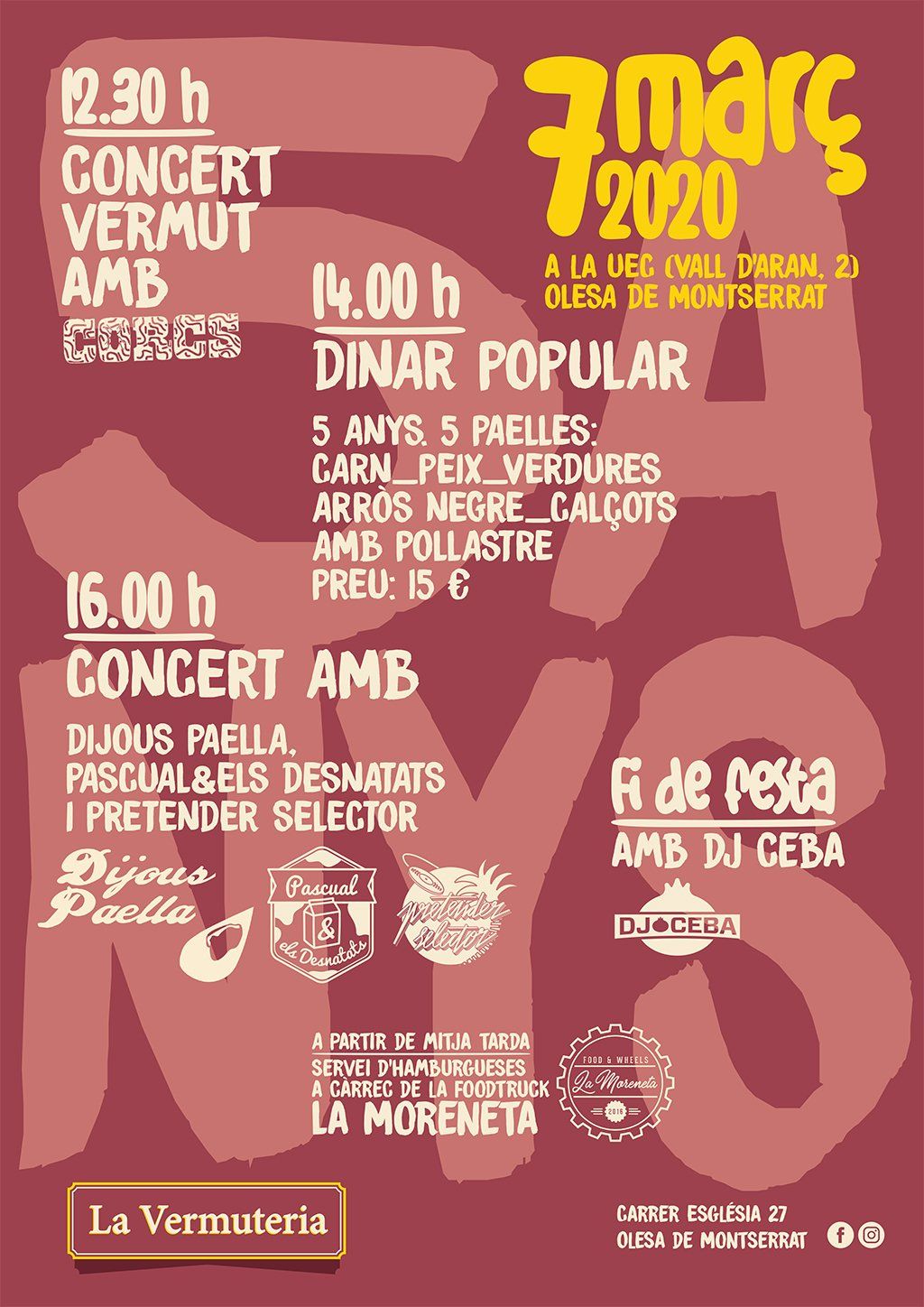 El proper 7 de març La Vermuteria celebra el seu 5è aniversari, com ja fa un parell d’anys els actes de celebració tindran lloc al local de la UEC d’Olesa (C/ Vall d’Aran, 2)