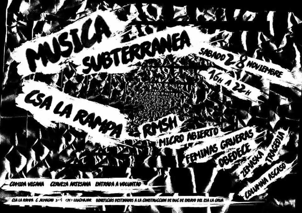 Aquest dissabte dia 28 de novembre al CSA La Rampa concerts solidaris amb la construcció del Local d’assaig de l’ESA Grua (C/ Castellbisbal 20).