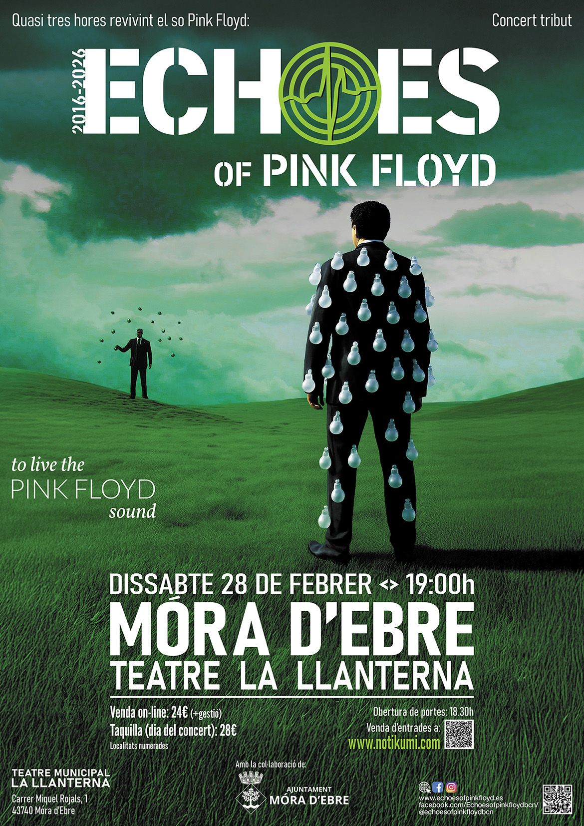 El 2026, Echoes of Pink Floyd celebra 10 anys recreant amb gran fidelitat l’esperit i el so de Pink Floyd. Formada per nou músics, la banda ofereix un potent espectacle musical i visual amb llums, projeccions i efectes sonors, interpretant temes mítics com Echoes, Shine On You Crazy Diamond o Wish You Were Here. El projecte vol acostar l’experiència de Pink Floyd —una de les bandes més influents de la història del rock— tant als fans de sempre com a aquells que mai van poder veure el grup original en directe.