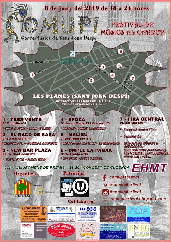 1er Festival COMUPI, Corre Músics de Sant Joan Despí. 6 localizaciones + 1 escenario central, Fira de Disc RIFF-RAFF, Pop Crimes, Chollomanía, Shinjani, etc...