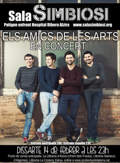 El dissabte 14 de febrer a les 23h ELS AMICS DE LES ARTS, dins de la gira de celebració dels 10 anys, faran un concert a Simbiosi. Les entrades anticipades estan a la venda per 20€ a La Llibreria d'Alzira (C/Hort dels Frares), Llibreria Samaruc d'Algemesí, Llibreria La Costera de Xàtiva o també estan a la venda online al següent enllaç: http://productesdelaterra.cat/home/12366-comprar-entrada-concert-els-amics-de-les-arts-a-alzira-1563101961247.html
