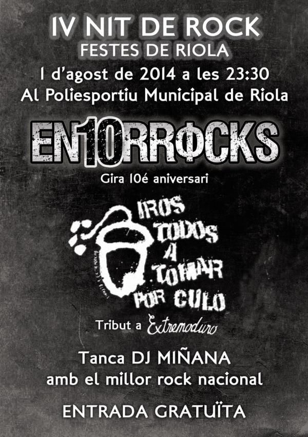 Una d'eixes nits d'estiu que sempre estaven marcades en roig al calendari torna a les nostres agendes. La nit de rock de Riola, on Enderrocks ja tinguérem la sort de compartir cartell amb Mugroman, La Gossa Sorda o Saurom, es reprendrà en la seua quarta edició la nit del divendres 1 d'agost al Poliesportiu Municipal de Riola. Des de les 23:30, i amb entrada totalment gratuïta, Enderrocks ho donarem tot acompanyats d'Iros a tomar por culo, el millor tribut existent a Espanya d'Extremoduro, el, probablement, millor grup de rock del país. A més, per a rematar la nit i que no ens quedem amb ganes de més canya, tindrem a DJ Miñana amb una gran selecció de rock nacional.