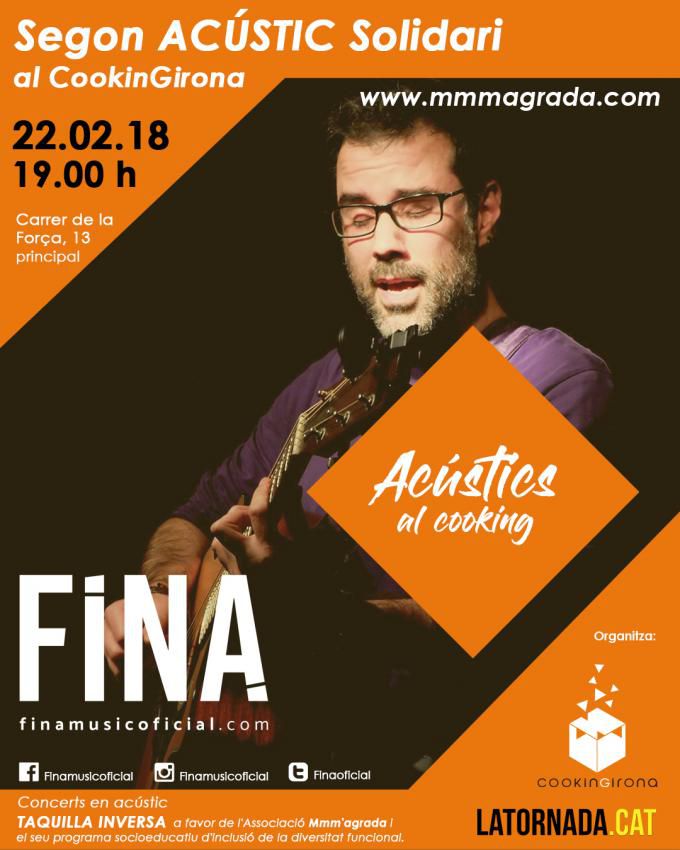 Música de proximitat i per a una bona causa. El cantautor Fina s'uneix a aquesta iniciativa per oferir un concert solidari per recaptar fons per la inclusió a la societat de persones amb diversitat funcional. El dijous 22 de febrer, a partir de les 19h, el cantautor serà el protagonista dels Acústics al Cooking amb un concert completament acústic en què el públic podrà gaudir de les cançons del gironí a cau d'orella.