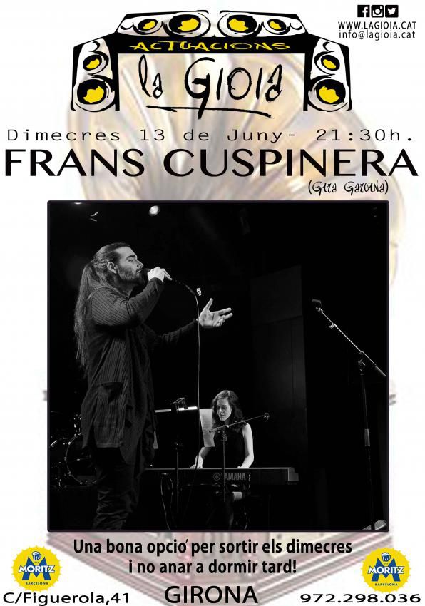 Acompanyat per la pianista María Poyatos, Frans Cuspinera ens presenta el seu primer disc 'Garoina' (Picap), a La Gioia Restaurant & Pizzeria. Un concert íntim en format duet on es podran escoltar els temes del disc i algunes versions d'una manera molt especial.