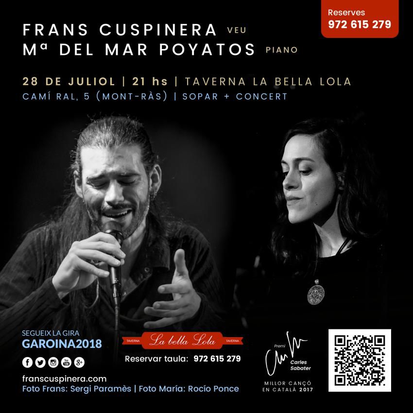 Acompanyat per la pianista María Poyatos, Frans Cuspinera presenta el seu primer disc 'Garoina' (Picap), a la Taverna La Bella Lola de Montrás, Cataluna, Spain. Un concert íntim en format duet on es podran escoltar els temes del disc i algunes versions d'una manera molt especial.