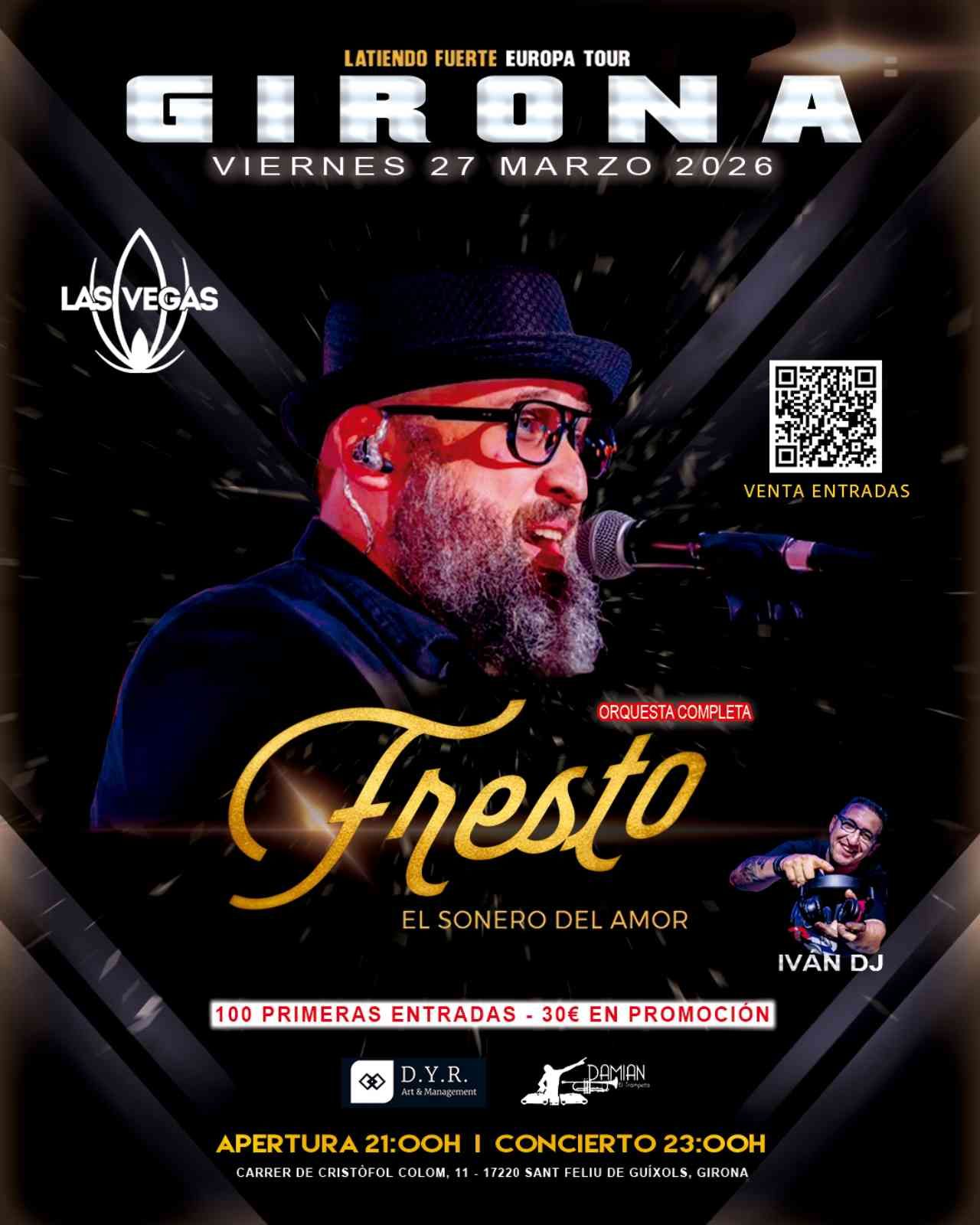 Gaudeix en directe de Fresto, "El Sonero del Amor", que arriba amb una orquestra completa i el seu estil autèntic, elegant i profundament romàntic. La vetllada inclourà la interpretació de grans èxits mundials com "Me hace daño verte", "Latidos", "Beso roto" i "Quédate". Opertura Iván Dj + Social