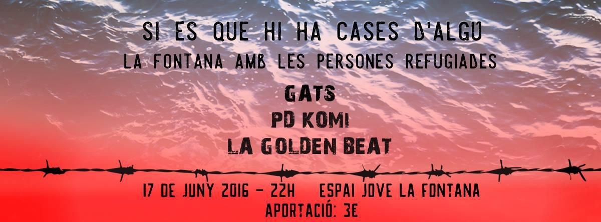 Sota el nom “Si és que hi ha cases d’algú: La Fontana amb les persones refugiades”, les treballadores dels diferents serveis de l’equipament (Espai Jove la Fontana, Centre de Recursos per a les Associacions Juvenils de Barcelona (CRAJ), Pij Gràcia i Consell Joventut de Barcelona) hem preparat aquest concertàs amb les actuacions de Gats, PD Komi i La Golden Beat per una molt bona causa! Els fons recollits es destinaran a la plataforma Stop Mare Mortum.