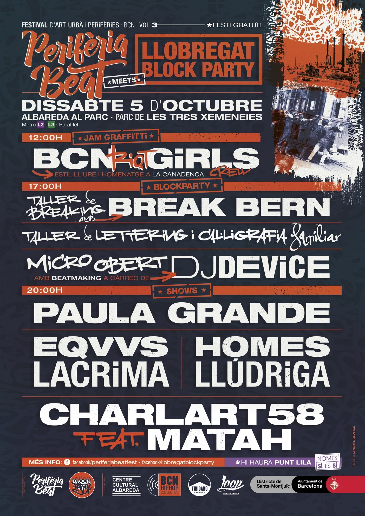 En esta tercera edición, Llobregat Block Party y Periferia Beat unen sus fuerzas para ofrecer un evento HIP HOP gratuito en el Parc de les Tres Xemeneies con talleres, micro libre, jam de graffiti y conciertos al aire libre.