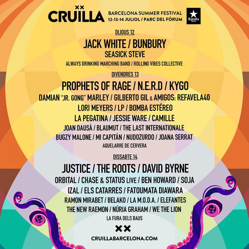 La 9a edició del Cruïlla té com a caps de cartell Jack White, Prophets of Rage, N.E.R.D, Kygo, The Roots i Justice. A més, comptarem amb artistes de la talla de David Byrne, Orbital, Damian “Jr. Gong” Marley, Ben Howard, SOJA, LP o Gilberto Gil.
