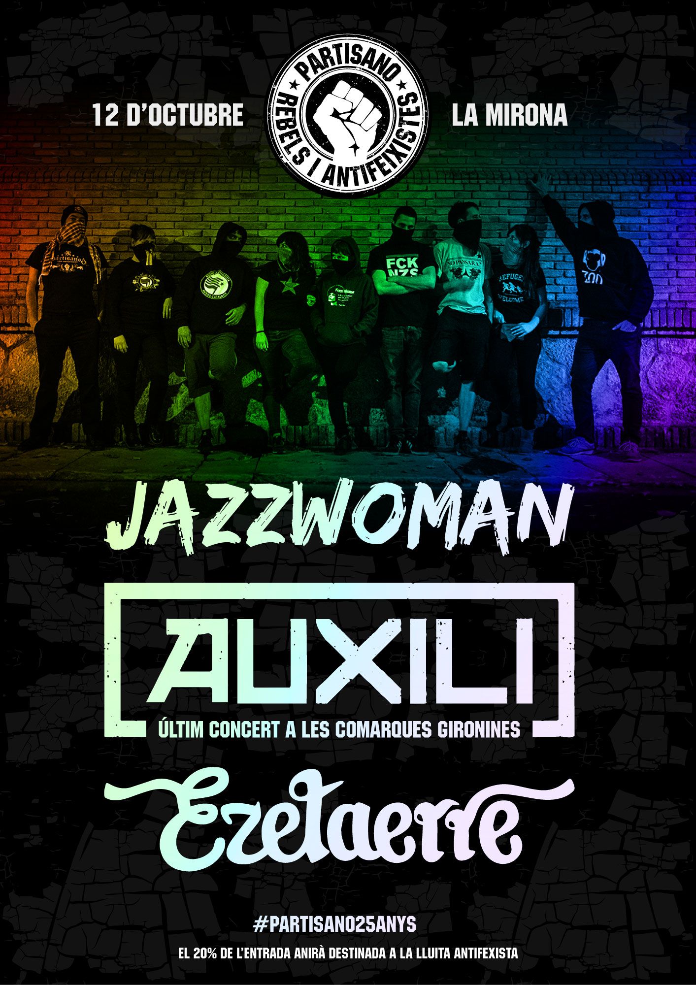 Sempre hem dit que el 12 d’octubre no tenim res a celebrar perquè estem contra el feixisme, el racisme, el masclisme i l’homofòbia, però sí que celebrem la lluita contra qualsevol forma d’intolerància. Per això el 20% de l’entrada d’aquest concert anirà destinada a la lluita antifeixista.