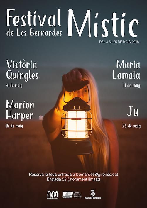 Ens agrada descobrir propostes. Propostes atrevides, singulars, úniques. Propostes joves però carregades de futur. I això és el que farem cada divendres de maig. Convertirem l'antiga església de la casa de cultura Les Bernardes de Salt en un cafè-teatre on gaudir d'algunes de les propostes més prometedores del moment. Quatre nits, quatre estils, quatre veus. Us convidem a endinsar-vos al Festival Místic i descobrir aquells noms que d'aquí a pocs mesos encapçalaran els cartells dels principals festivals del país.