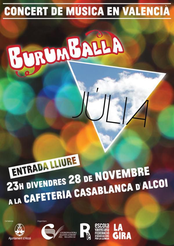 Divendres 28 de novembre, a les 23:20, els grups Júlia i Burumballa ens oferiran un concert al pub Casablanca d'Alcoi. El concert és una iniciativa de la Coordinadora pel Valencià i s'inscriu dins dels concerts de La Gira. L'entrada és lliure. Burumballa és un nou grup format per gent molt jove, estudiants del Comtat. Júlia és una formació alcoiana de recent creació. Tot i el seu -de moment- curt recorregut, el seu primer treball, "El Mecanoscrit", va ser guardonat en la 8a edició dels Premis Ovidi Montllor com a millor maqueta de l'any 2012. En aquest moments es troba finalitzant el procés de creació del que serà el seu primer disc d'estudi, que veurà la llum durant la primavera de 2015 amb el segell valencià Malatesta Records. En la cafeteria Casablanca ens oferiran un set acústic però electrizant, combinant cançons d'El Mecanoscrit i algunes noves composicions del futur disc.