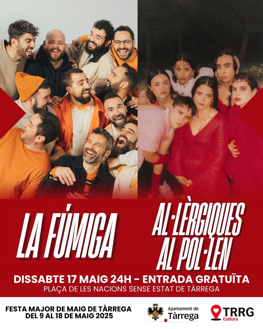 El dissabte 17 de maig, després de La Nit del Tararot, serà el torn per a les actuacions de La Fúmiga i Al·lèrgiques al pol·len a la plaça de les Nacions Sense Estat de Tàrrega. El grup d’Alzira La Fúmiga viu un moment de plenitud musical i a Tàrrega presentarà un nou EP de 4 cançons que continua com a seqüela de l'últim disc Tot està per fer (2024), amb el qual van actuar als principals festivals explorant nous camins en el pop electrònic.