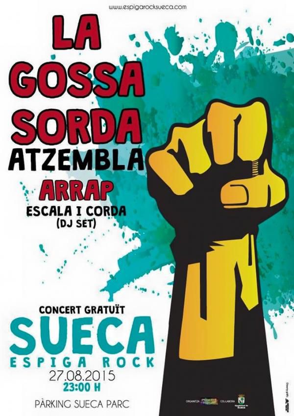 No et pots perdre l'Espiga Rock d'enguany. Concertàs gratuït! El 27 d'agost en Sueca (Sueca Parc). La Gossa Sorda tocarà per última volta a Sueca, acompanyats dels Atzembla, els Arrap i amenitzats en tot moment pels DJ's Escala i Corda. Entrada gratuïta i preus populars!