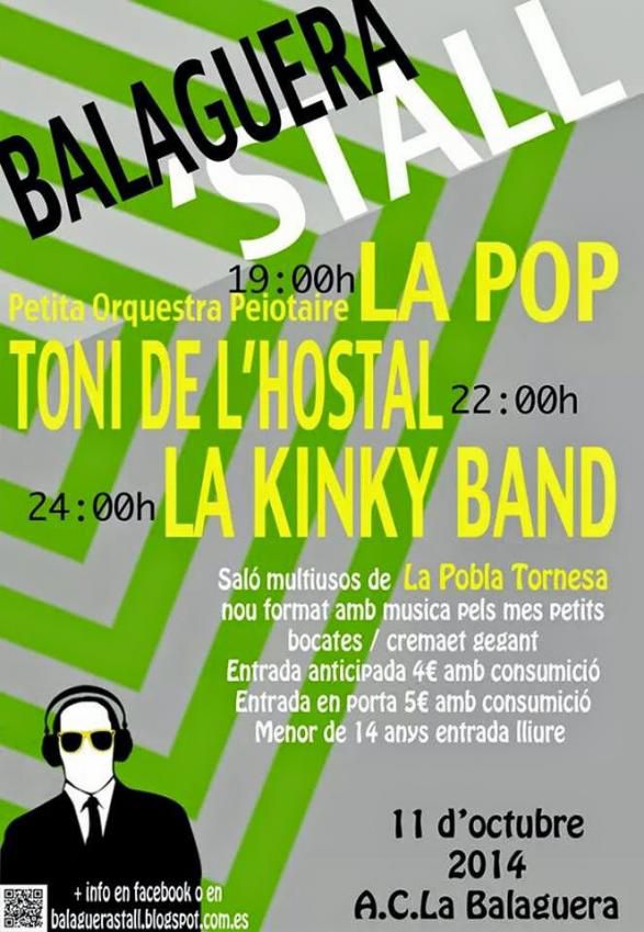 L'associació cultural Balaguera de la Pobla Tornesa ja fa anys que organitza una nit musical per a la jovenalla de la comarca, pel qual ja ha passat l'orquestra de la Kinky Band, però enguany mamprendran de vesprada amb el xou de la pOP per a la xicalla i, abans de la Kinky, un recital d'humor intel·lectual a càrrec de Toni de l'Hostal. El preu de l'entrada inclou una consumició. A banda, a les 9 de la nit faran un cremadet gegant i també hi hauran rues per a sopar.