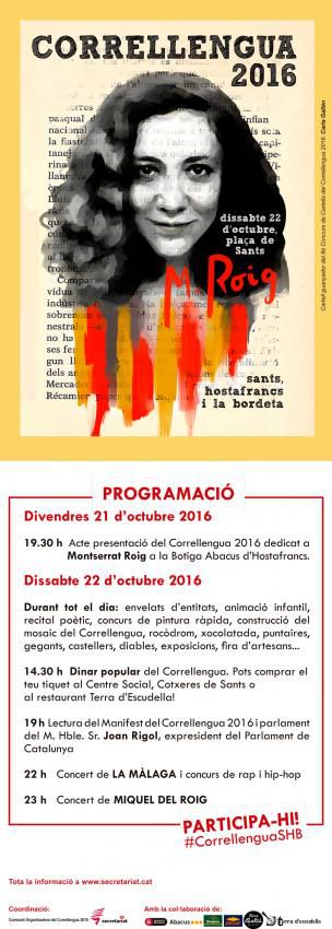 Dissabte 22 arriba el Correllengua de Sants, Hostafrancs i la Bordeta 2016. Durant tot el dia se celebraran més d'una vintena d'activitats a la plaça de Sants, enguany centrades en la periodista i escriptora Montserrat Roig, i a les 22h concert amb La Màlaga, concurs de Rap i hip-hop i concert de Miquel del Roig.