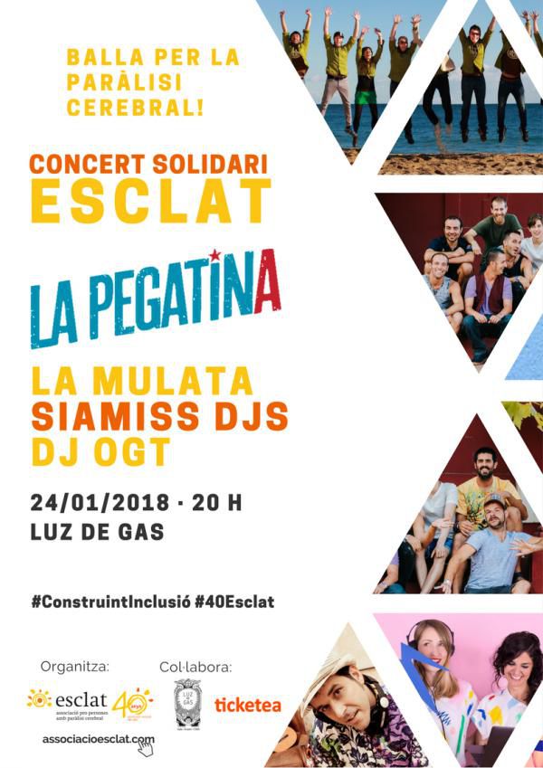 L'Associació Esclat organitza un concert solidari únic de la mà de 4 referents del panorama musical català. La Pegatina, La Mulata, Siamiss Djs i Dj OGT seran els protagonistes del concert “Balla per la paràlisi cerebral”, a favor dels projectes futurs d'habitatge d'Esclat per a persones amb discapacitat, que se celebrarà el 24 de gener, a les 8 del vespre, a la sala Luz de Gas de Barcelona.