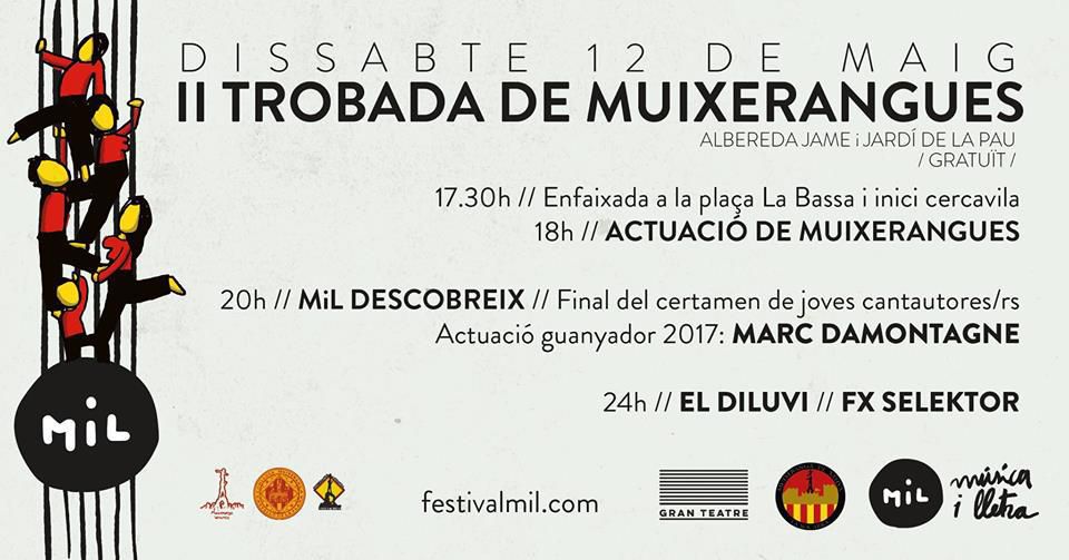El Diluvi, un grup de rock amb ànima d’autor, tocarà al concert gratuït de la festa de presentació del MiL d’enguany que a més s'ha co-organitzat amb la Muixeranga de Xàtiva per coincidir amb la II Trobada de Muixerangues, perquè la cançó d'autor, la festa i la tradició van de la mà. Entre enfaixades i figures, al Jardí de la Pau també sonaran els finalistes d’enguany del MiL Descobreix -el certamen de joves cantautores i cantautors- una secció del festival que l'organització va estrenar amb molt d'èxit a l’edició anterior. Músics de tot l'estat, entre 14 i 35 anys, han enviat les seves propostes artístiques i l'organització repartirà 2.700 euros en metàl·lic en premis per a autors no editats. El guanyador de l'any passat, el borriolenc Marc Damontagne, clourà l’entrega de premis. Els assistents -com l’any passat- podran tornar a votar en directe els finalistes del MiL Descobreix i atorgar el premi del públic. El Diluvi i el punxa discos xativí Fx Selecktor tancaran la primera gran nit del MiL 2018 i de la II Trobada de Muixerangues.
