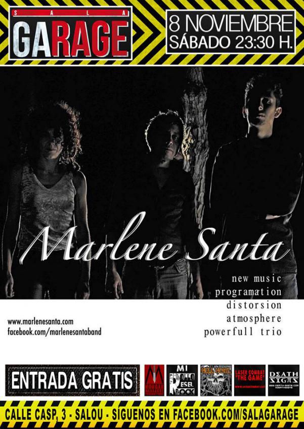 Marlene Santa es un grupo de rock/electronico de argentinos e italianos que viven en Tarragona; el 8 de noviembre tocarán en la Sala Garage Salou (Tarragona), presentando canciones de su primer disco homónimo así como otros temas que han ido componiendo después de ese trabajo. Tocamos un rock electrónico y poderoso, un género original que os envitamos a explorar.