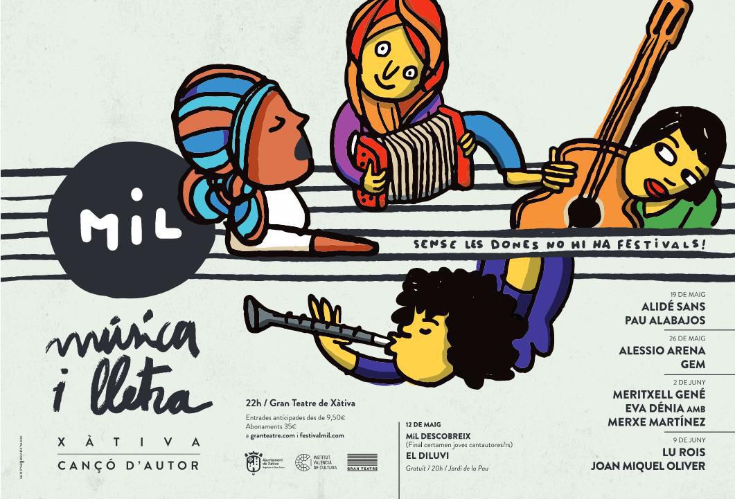 Al Festival Música i Lletra, Xàtiva cançó d'autor, 2018 (MiL) cantaran Eva Dénia, Lu Rois, Alidé Sans, Gem, Meritxell Gené, Pau Alabajos, Joan Miquel Oliver i Alessio Arena. Elles guanyen cinc a tres, en un festival menut en format, però ric en qualitat i idees, varietat d'estils de la música d'autor i veus vingudes de tot el país, cantant en diverses llengües i portant emocions per a tots els gustos. Guanyen elles perquè aquesta ha estat la voluntat del director artístic, el músic i activista cultural, Feliu Ventura, i del regidor del Gran Teatre de l'Ajuntament de Xàtiva, Alfred Boluda. Com diu el lema de l'edició d'enguany “sense les dones no hi ha festivals!” i l'organització s'ho ha agafat al peu de la lletra. El jurat del MiL descobreix 2018, el certamen de joves cantautores/rs del festival, serà -enguany- integrament femení: cinc dones del món de la cultura xativina decidiran els guanyadors no editats.