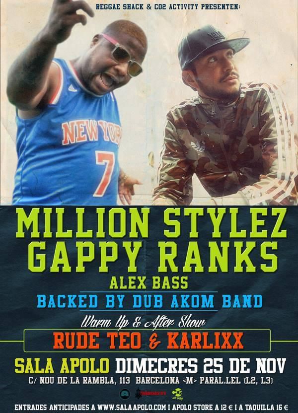Dos dels principals artistes Reggae-Dancehall a nivell europeu; el suec Million Stylez i l'anglès Gappy Ranks han escollit la Sala Apolo de Barcelona per presentar al nostre país els seus nous discos.