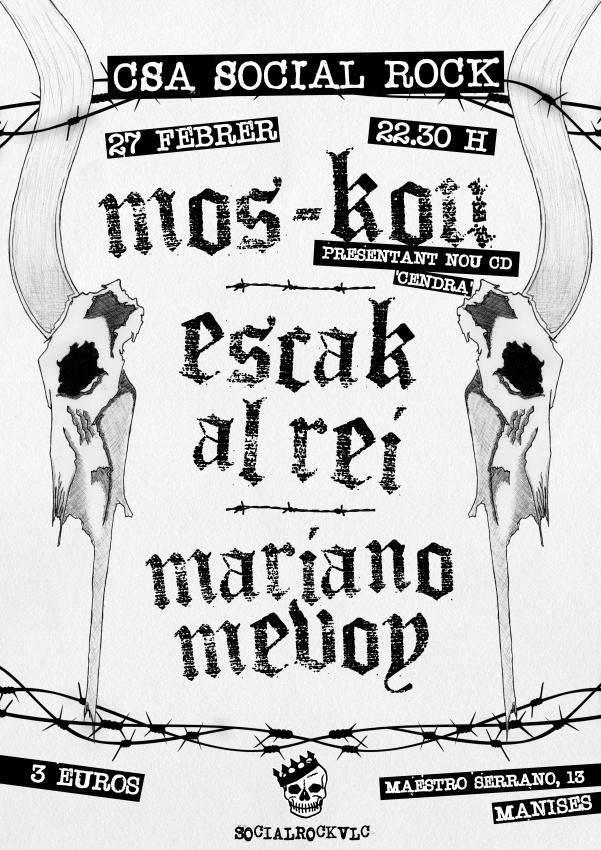 El concert serà a la sala CSA Social Rock de Manises i contarem amb dos grups que han sigut per a nosaltres exemple com a músics i com a persones: Mariano Mevoy i Escak al rei
