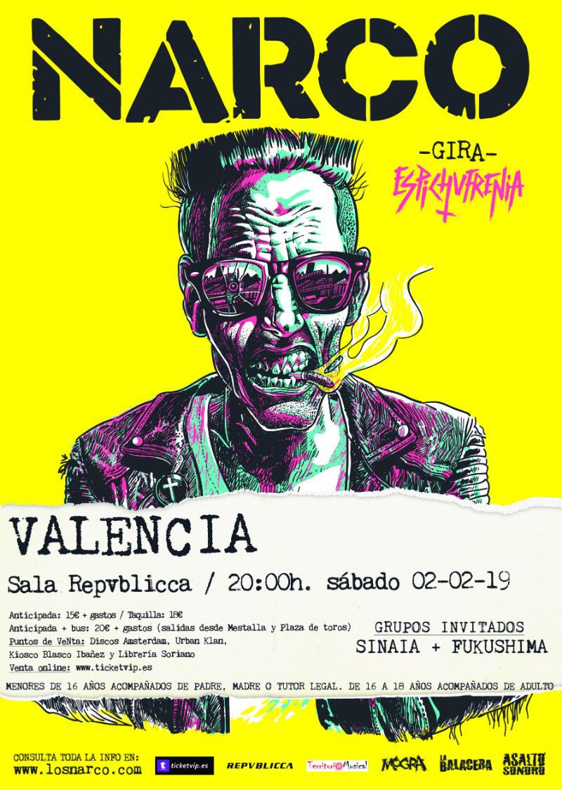 La sala Repvblicca de Mislata (València) acogerá tres propuestas de rock duro la noche del sábado, 2 de febrero. Los veteranos Narco presentarán su octava referencia discográfica: Espichufrenia (La Balacera, 2017). El quinteto Sinaia hará una pausa en la grabación de su nuevo disco para mostrar su punk-rock en la capital del Turia por primera vez. Por último, la velada servirá para que Fukushima debute sobre los escenarios.