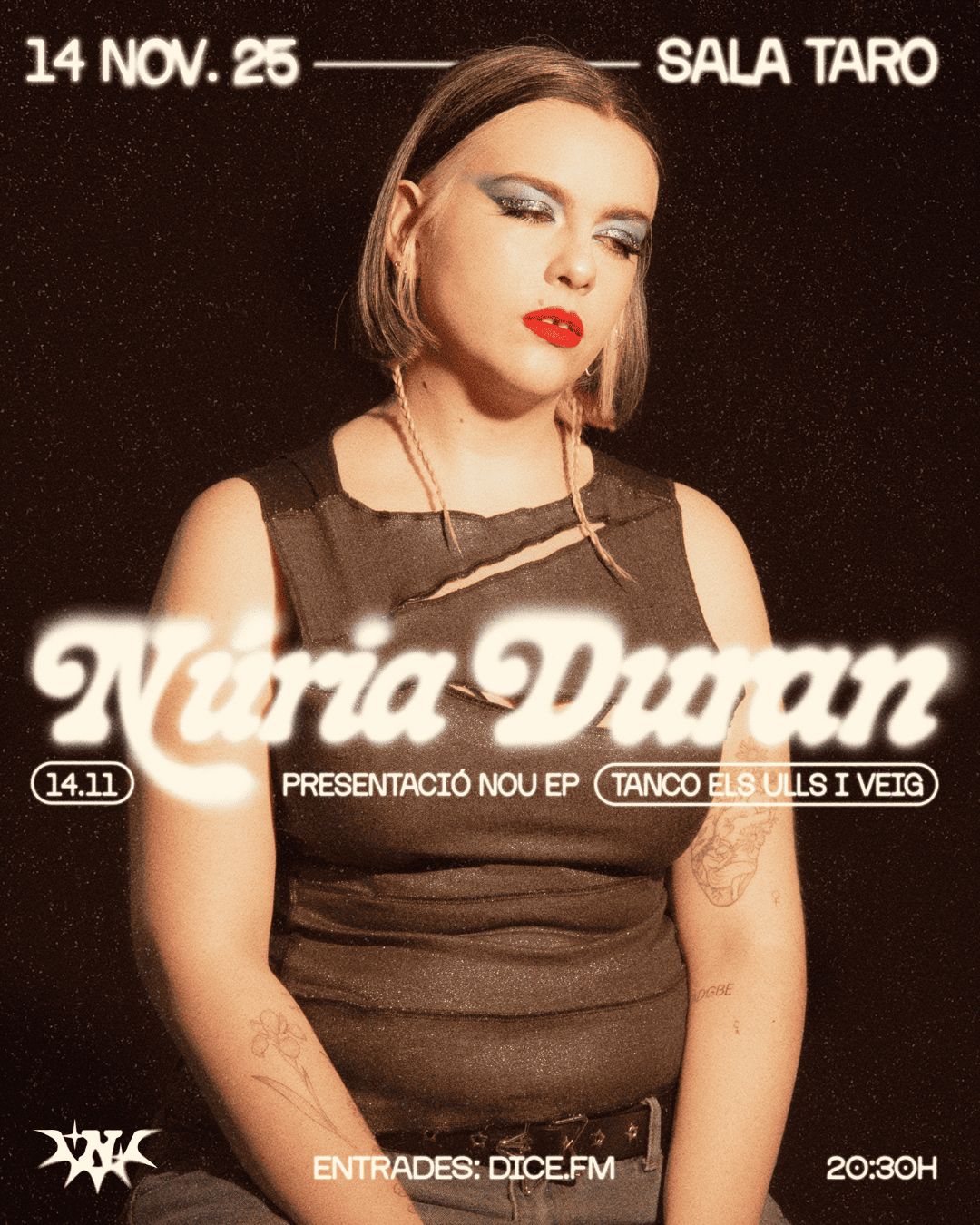 Núria Duran és una artista emergent en l'escena musical catalana, amb una veu captivadora i una presència escènica carismàtica. L’octubre de 2025 publica el seu nou EP, tanco els ulls i veig. Reflexionant sobre la identitat, la comunitat i l’amor, ens intenta ensenyar qui s’amaga darrere la màscara de Núria Duran.