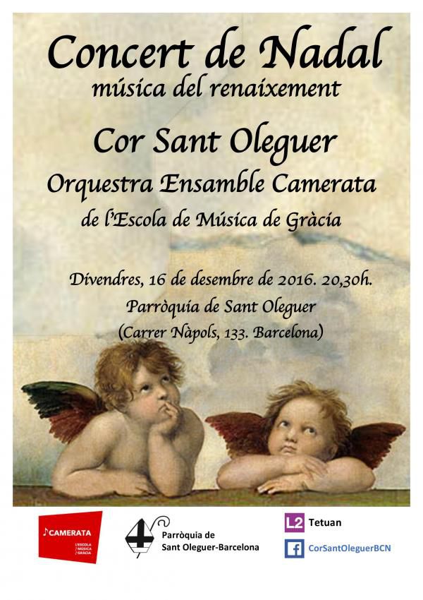 Concert de música nadalenca del temps del renaixement. Amb l'Ensamble de la Camerata de l'Escola de Música de Gràcia, solista i el Cor Sant Oleguer de Barcelona. Sota la direcció de Bruno Nájera. Entrada-donatiu el mateix dia en benefici de les despeses de la parròquia i la tasca social que desenvolupa.