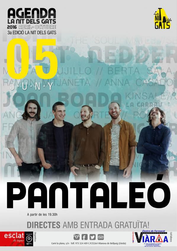 Després de guanyar el premi Joventut del Sona 9 el 2014 i actuar en escenaris tant importants com el del Mercat de la Música Viva de Vic arriben amb el su 1r disc sota el braç "Reina Victòria" amb molt bona crítca dins els experts musicals. La banda actual referent del pop aquest diumenge a l'Esclat de Tapes de Vilanova de Bellpuig. PANTALEÓ EN ACÚSTIC. ENTRADA GRATUÏTA