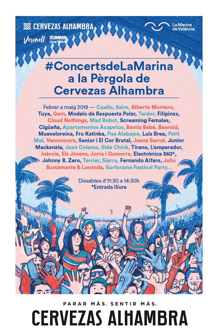 La Pèrgola de Cervezas Alhambra de La Marina de València 2019 abre el telón el próximo 2 de febrero con récord de citas consecutivas: dieciséis sábados y más de cuarenta propuestas sonoras conformarán un cartel que lucirá sin pausa todos los sábados a mediodía de febrero a mayo en este ciclo único e irrepetible junto al mar que ha revolucionado el ocio diurno de València, con más de 18.000 espectadores en 2018.