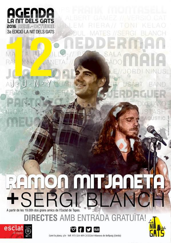 Aquest diumenge 12, doble sessió de bona música a La Nit dels Gats. RAMON MITJANETA ens presentarà les cançons fresques i plenes d'optimisme del seu nou disc "MENTRE EL MÓN REPOSA" i a continuació serà el torn d'en SERGI BLANCH que ens portarà, amb el seu HANGED MAN, de viatge cap al folk pop americà dels 70 fins al blues més profund.