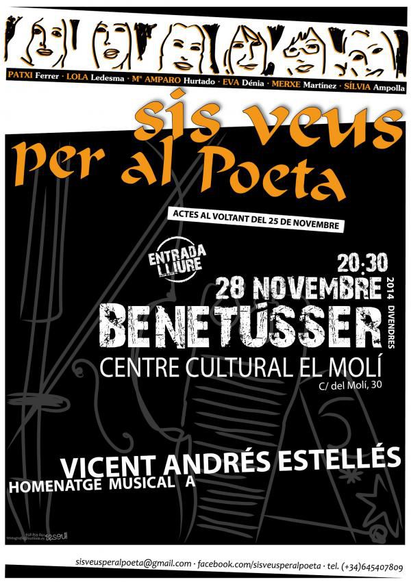 Dins dels actes programats al voltant del 25 de Novembre, Sis veus per al Poeta actuem al Centre Cultural El Molí de Benetusser ( C/ Molí , 30) el divendres 28 de novembre a les 20:30.