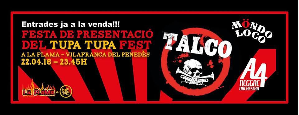 Els italians TALCO estaran el pròxim divendres 22 d'abril en concert per primer cop a Vilafranca, a la sala La Flama, descarregant tota la seva energia, festivitat i música reivindicativa en el marc de la festa de presentació de la III edició del Tupa Tupa Fest, - festival solidari per lluitar contra l'Atròfia Muscular Espinal -.