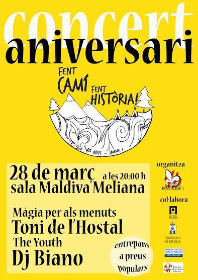 L'Agrupament Escolta Jaume I de Meliana (l'Horta) enugany en fa quaranta i ho celebra amb una exposició retrospectiva i un concert amb els jóvens de The Youth, el posadiscs orxater Biano i el boy scout riberenc Toni de l'Hostal, que té més de boy que d'scout.