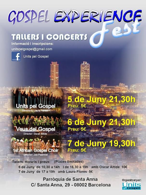 Festival Gospel Experience el primer cap de setmana de juny, a Santa AnnaGospel Experience Fest, es un festival de Gospel, que es celebrarà en la Església de Santa Anna (Barcelona), els dies 5, 6 i 7 de juny, i que comptarà amb concerts del grup organitzador: Units pel Gospel (divendres a les 21’30 h), Veus del Gospel (dissabte a les 21’30 h) i 1st African Gospel Choir (diumenge 19’30 h). Tancarà el Festival Units pel Gospel.