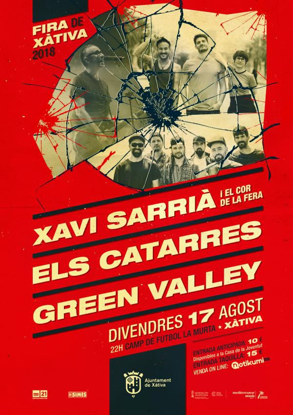 Concert de Xavi Sarrià, Els Catarres i Green Valley organitzat per l’Ajuntament de Xàtiva dins de les festes de la Fira d’Agost de la ciutat de La Costera. Si l’any passat van ser Txarango, Aspencat en el recordat concert de comiat i les xiques de Tremenda Jauría amb el seu reggaeton insurgent les encarregades de fer ballar al personal, enguany Xàvia Sarrià l’ànima del grup Obrint Pas, l’alegria i el positivisme que transmeten Els Catarres i els missatges de pau i consciència crítica des del reggae dels Green Valley, faran de la nit del 17 d’agost un punt de trobada per tots els que vulguen assistir a una nit per recordar.
