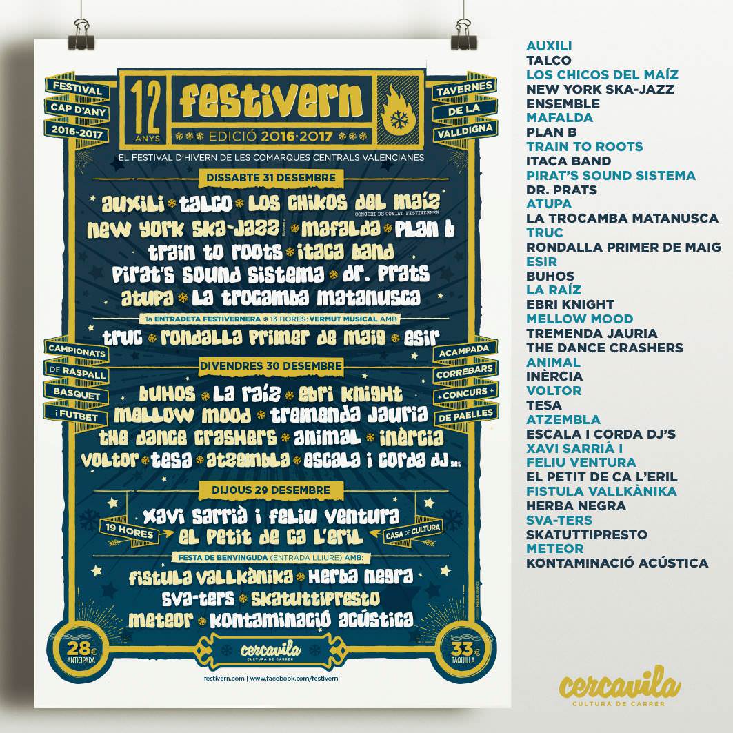 Aquest matí per sorpresa circulava pels whatsapps de mig món el cartell del Festivern 2016/17. Cercavila fa públic el cartell del festival d’hivern més important a crit de “Ha arribat l’hora d’encendre la flama, comença el compte enrere. El Festivern 2016/2017 ja és una realitat! #festivern1617 #hopetaremtot, ho petarem!!!!”