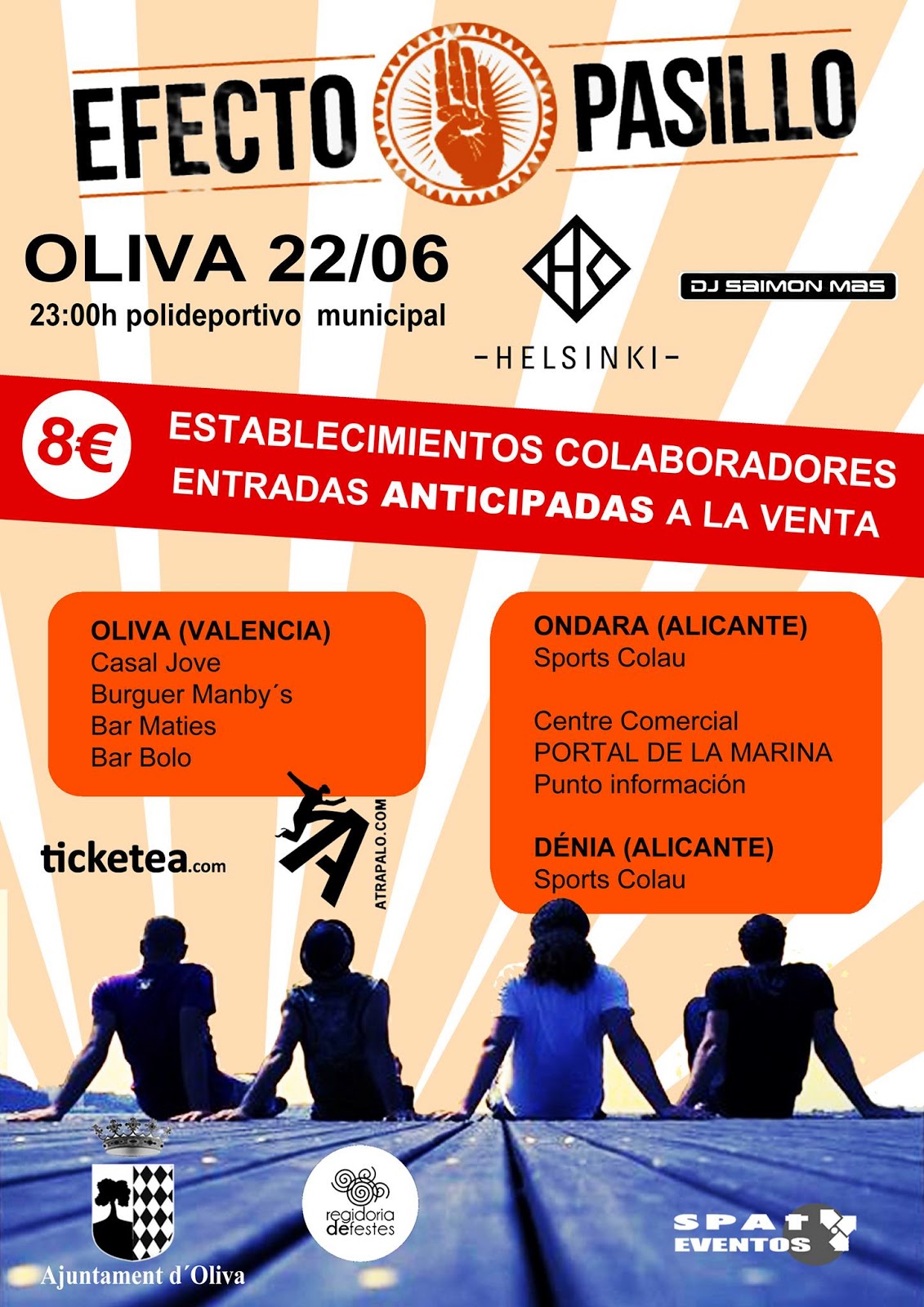Efecto Pasillo un dels grups revelació de l'estiu pasat juntament amb la formació de rock-indie Helsinki, acutaran el próxim 22 de juny a les 23.00 hores, al Poliesportiu Municipal d'Oliva. L'ecarregat de tancar el concert será el Dj Saimon Mas. Amb aquest complet cartell, el concert organitzat per la regidoria de festes de l'ajuntament d'Oliva i per Spat Eventos donarà la benvinguda a l'estiu.El cartell l'encapçala la banda canària Efecto Pasillo. Amb el seu single, "Pan y Mantequilla", integrat al seu últim disc, "El misterioso caso de..."(2013), la banda insular ha aconseguit convertir-se en un dels grups més famosos de l'escena musical. Abans de donar el salt a l'escena estatal, Efecto Pasillo, va guanyar el premi ?Grupo Revelación del año? a Gran Canària, poc després de traure el seu primer treball titulat igual que la banda. El seu estil musical a mig camí entre el funk, pop i indie-rock va arribar a la península convertint-se en un gran èxit. El novembre passat foren nominats per als premis 40 Principales en la categoria de millor artista i la de millor cançó pel seu single Pan y Mantequilla. En poc temps aquest grup ha aconseguit un gran reconeixement tal com ho avala la crítica.