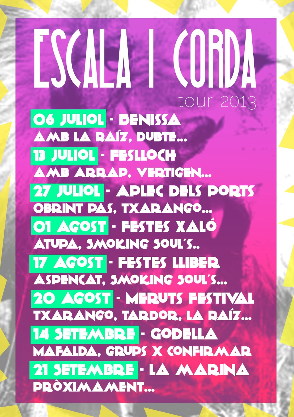 Els deejays valencians Escala i Corda han fet públic per les xarxes socials les dates on podrem veure'ls en directe. Tant al nord de Castelló com per València i les comarques centrals. Entre les cites figuren els principals festivals com són l'Aplec dels Ports a Morella, el Feslloch a Benlloch, o el Meruts Festival a Ontinyentaltres dates a destacar, les festes dels pobles de La Marina Alta (Benissa, Xaló, Lliber...).Encetaran, doncs, la gira d'estiu, a Benissa juntament amb el grup de La Safor, La Raíz i el grup local benisser Dubte -abans coneguts com Skapats-. El concert que és la Nit de Rock de les Festes que no es va poder celebrar per la pluja a Abril, es celebra el Dissabte 6 a la Plaça Jaume I precedit per altres activitats organitzades per la Comissió de Festes 2013. El concert començarà a les 00.30h de la nit.Vos deixem amb el cartell complet amb les dates. Des d'Escala i Corda "animen a tots a anar als concerts i sobretot quedar-se fins al final per ballar tots els ritmes que ens tenen preparats".