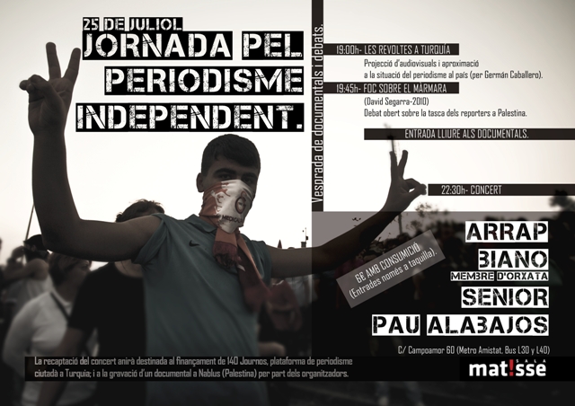 La sala Matisse, situada a la zona Cedro de València rebrà el proper 25 de juliol una jornada pel periodisme independent. Debats, projeccions audiovisuals i música seran els protagonistes del dia des de les 19:00h.La jornada començarà a les 19:00h on el fotògraf Germán Caballero mostrarà el seu documental centrat en les revoltes turques. La realitat de la llibertat dde premsa a Turquia. De Turquia a Palestina, on mitjançant a projecció del documental 'Fos sobre el màrmara', de David Segarra, es matindrà una xerrada de la tasca dels reporters al territori palestí. La programació d'aquestes dos activitats serà totalment debades per a qui vulga assistir. Finalment la nit anirà al compàs de la música creada en terra valenciana. Arrap, Senior i el Cor Brutal, Pau Alabajos i finalment Dj Biano posaran el punt i final a una vetllada. L'entrada al concert obrirà portes a les 22:30h, amb un preu de 6 euros. Els diners aniran destinats per recaptar fons per als 140 Journos (Plataforma de periodisme ciutadà a Turquia) i per finançar un documetal a Nablus, Palestina.