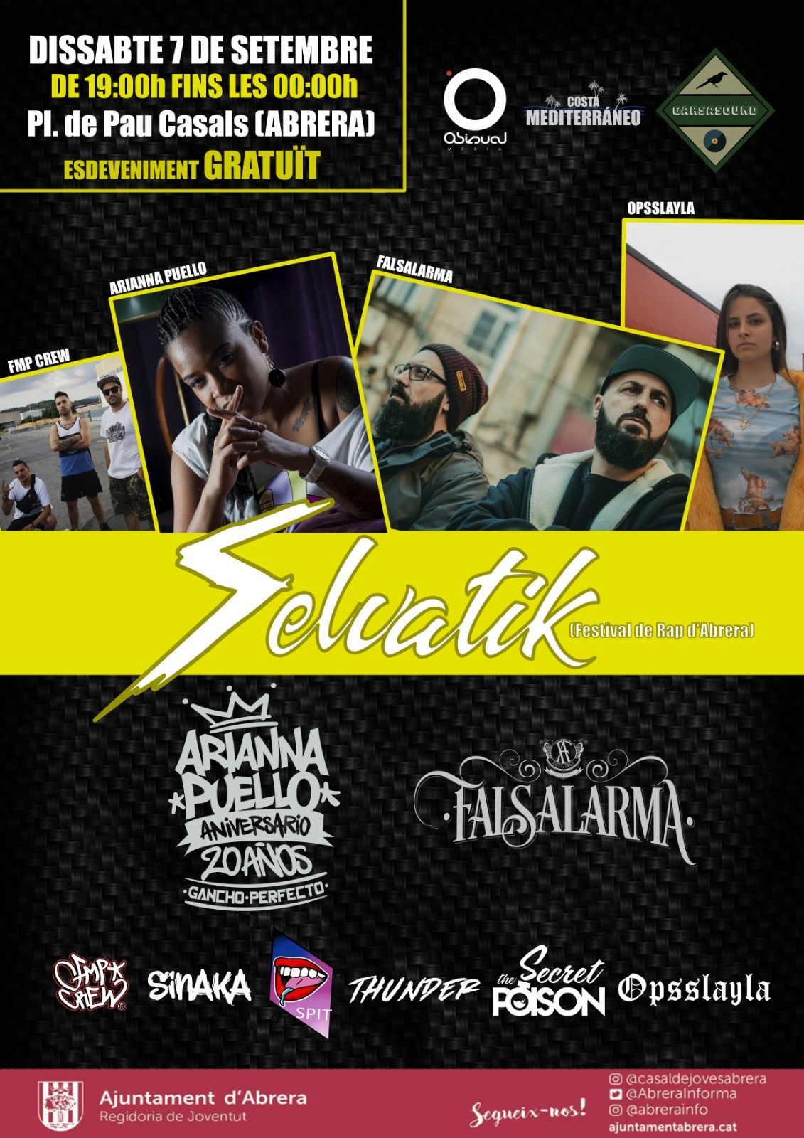 Primera edició del Selvatik: el Festival de Cultura Hip-hop d'Abrera, que s'organitza des de l’Ajuntament amb l’Associació de Joves Garsasound, la col·laboració de Santi Càmara i que comptarà amb les actuacions de la cantant abrerenca OppsLayla, Arianna Puello, FMP Crew, FALSALARMA, i més artistes convidats.