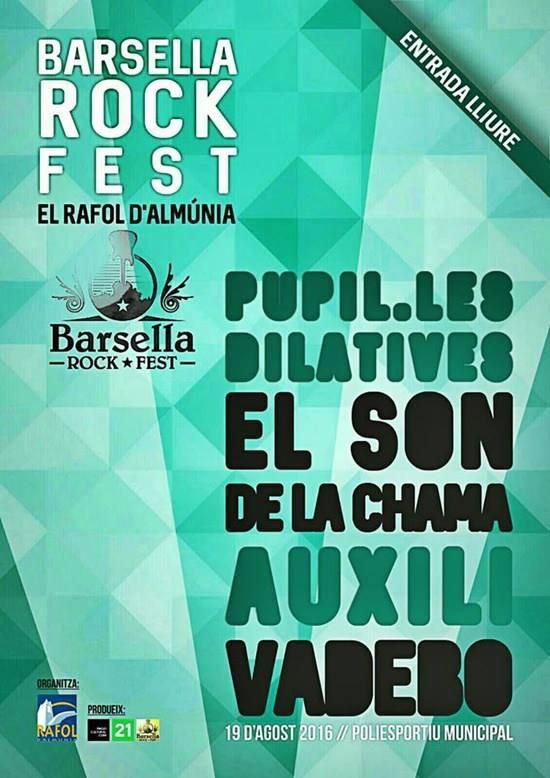 BARSELLA ROCK FEST, con entrada gratis y como sede el Polideportivo Municipal de El Ràfol d’Almúnia, lo protagonizarán desde las 11 de la noche las bandas Auxili, El Son de la Chama, Vadebo y Pupil.les Dilatives.