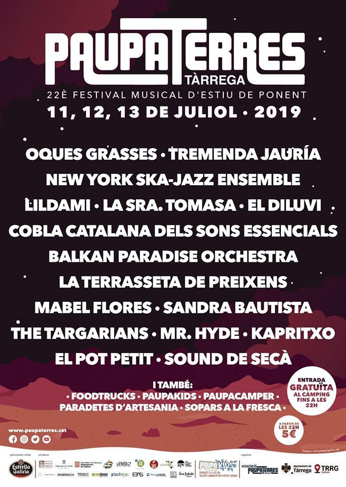 Tàrrega es prepara per celebrar de l’11 al 13 de juliol la 22a edició del Paupaterres - Festival Musical d’Estiu de Ponent, una de les cites culturals referents de l’estiu al territori. Organitzat per l’Associació Paupaterres i l’àrea municipal de Cultura amb suport de la Diputació de Lleida i el Departament de Cultura de la Generalitat de Catalunya, el certamen presenta una programació amb un ampli ventall estilístic: del pop-rock al rap'n'trap, sense oblidar les seves arrels situades en els sons mestissos, el folk o l’ska. Un total de 16 destacats grups i solistes del panorama musical actual conformen el cartell, amb noms propis com Oques Grasses, Lildami o La Sra. Tomasa. El Paupaterres potencia la presència del gènere femení a la programació i ofereix propostes artístiques liderades per dones com és el cas de Balkan Paradise Orchestra, Sandra Bautista, El Diluvi, Mabel Flores, la Cobla Catalana dels Sons Essencials, Mr Hyde o Tremenda Jauría. Entrada gratuïta fins les 22h.
