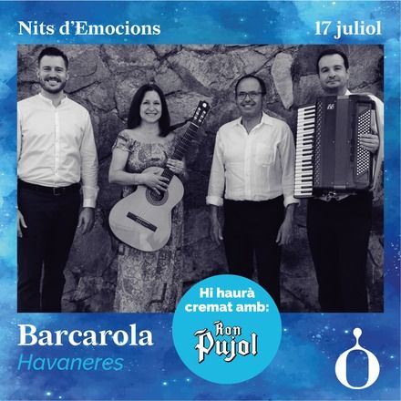 El grup de música Barcarola actuarà dissabte 17 de juliol a les 23.00 hores a la terrassa del complex Sorli Emocions del Grup Sorli, ubicada a Vilassar de Dalt, en el marc de les ‘Nits d’Emocions’, una iniciativa que combina la millor música en directe, gastronomia i cocteleria a l’aire lliure. Aquesta és la segona actuació d’una activitat que se celebra tots els dissabtes de juliol, agost i el primer cap de setmana de setembre amb un total de nou nits on les emocions són les principals protagonistes.